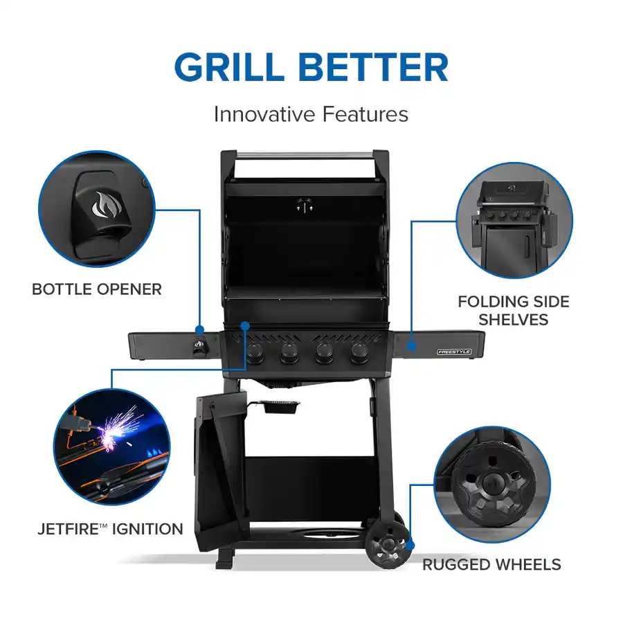 | Freestyle PRO 365 | 3 | Jah, Sizzle Zone™ keraamiline | 51 × 45 cm | 3 775 cm² | Malmist WAVE + Sizzle Zone rest | ACCU-PROBE™ | Kokkupandav külmariiul tööriistakonksude ja pudeliavajaga | Suletud aluskapp uksega | Kompaktne ja võimas, ideaalne terrassile, ridaelamu hoovi või väiksemasse aeda |