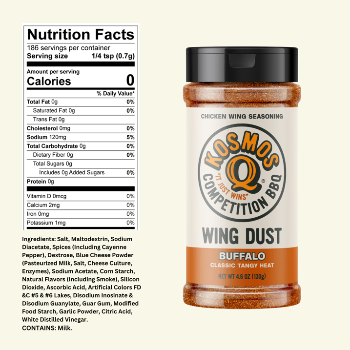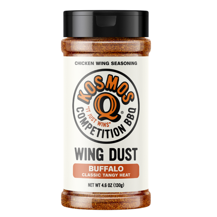 "Kosmo's Q Buffalo Wing Dust Rub" suteikia legendinio amerikietiškojo Buffalo padažo skonį - ir visa tai be netvarkos. Šis aštrus ir šiek tiek kreminis įtrinimas specialiai sukurtas vištienos sparneliams, bet juo taip pat puikiai tinka popkornai, keptos bulvytės, keptos daržovės ar net sumuštiniai.