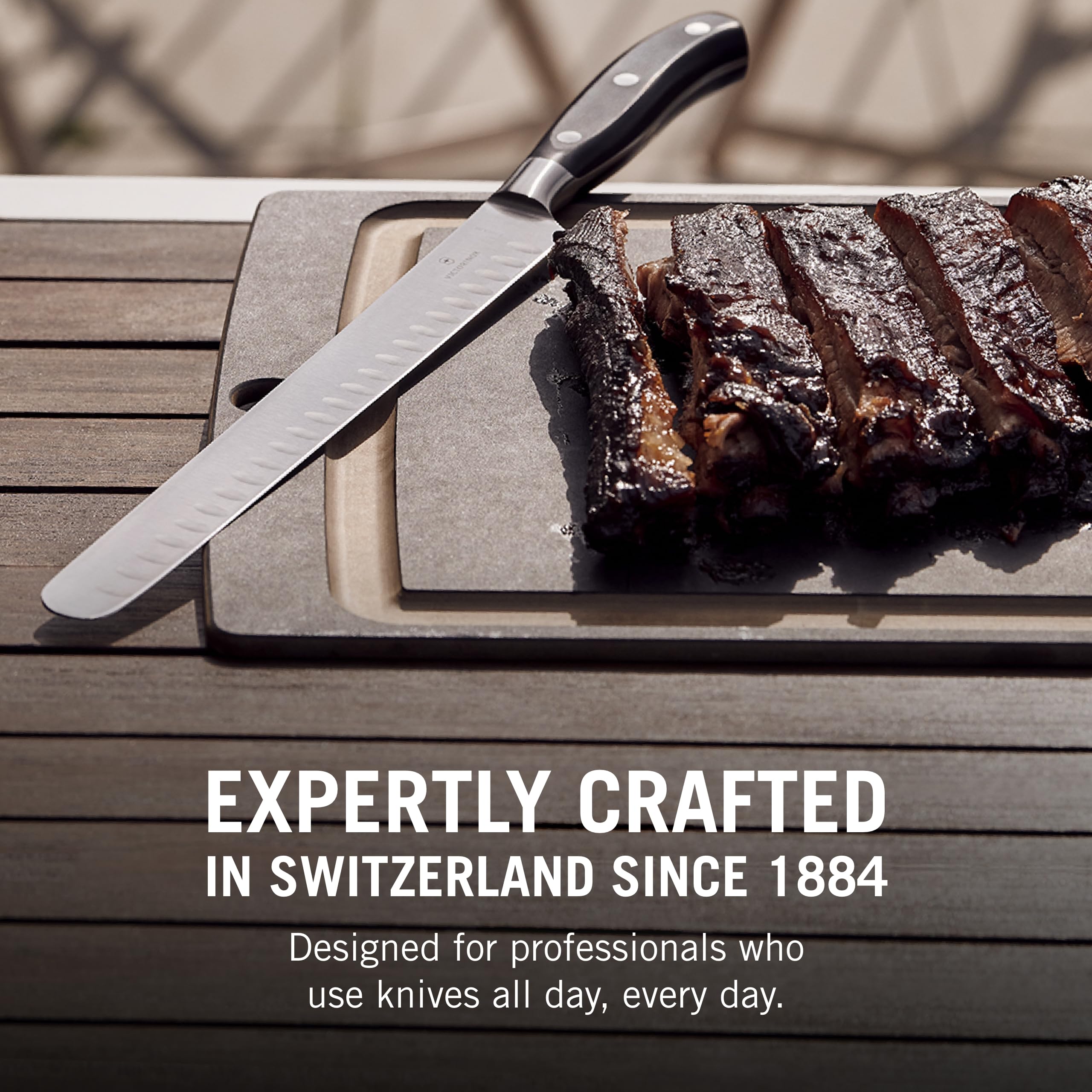 The Victorinox "GRAND MAITRE" forged slicing knife fulfils the function of its essence. Not only does it look good, but the forged blade is very durable and its "curved edge" ensures that it cuts evenly without tearing the meat. The elegant and ergonomic handle ensures a comfortable grip when slicing any type of meat.